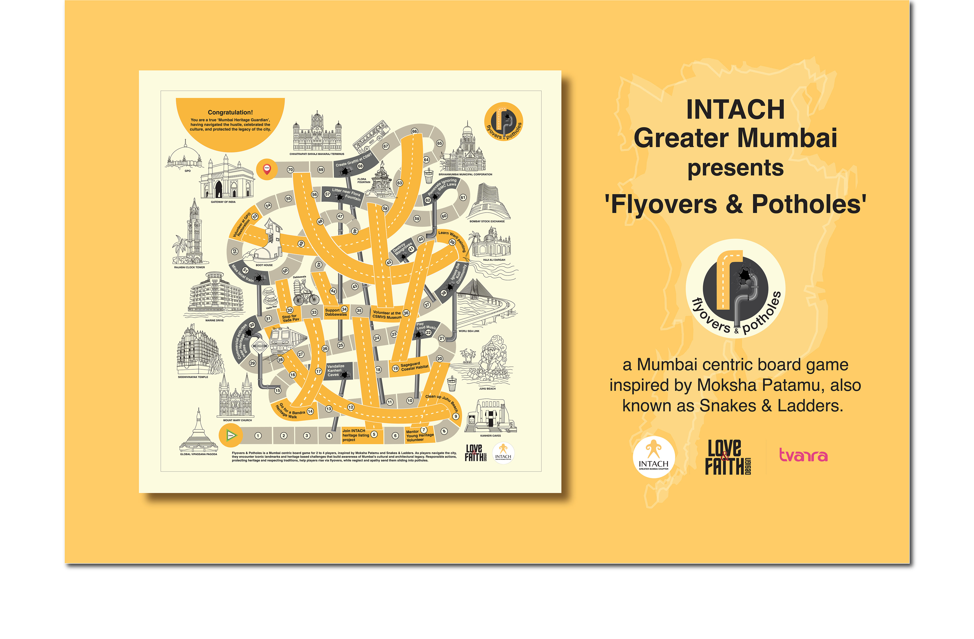 The task was to design a board game centred around Mumbai, inspired by Moksha Patamu and Snakes & Ladders. In this game, players move across the board, encountering iconic landmarks and completing heritage-based tasks that raise awareness of Mumbai’s culture, history, and the importance of preserving its built and living heritage. Mumbai is rapidly developing, with numerous flyovers and bridges reducing our commute times. However, the persistent potholes continue to slow us down and inconvenience commuters. This contrast inspired the game's name: "Flyovers & Potholes." The project began with initial sketches to develop a specific style and colour scheme suitable for printing on Khadi cloth. Then I collaborated with my house carpenter to develop a design for the pawns and dice.