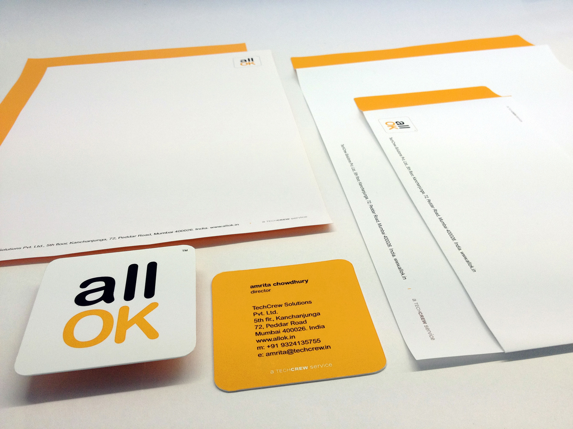 Naming and Brand Identity design for tech service allOK. What happens when technology fails you, and you don't have an IT department that will rush to your help? Here comes allOK, a tech support service from TechCrew Pvt. Ltd. With the growing dependency on Technology, it is very reassuring to know that there is a tech support service who will be there at any time no matter where you are, to ensure that your technology is all okay. And that's how the name 'allOK' was born. allOK - two powerful words that guide the brand's delivery each time every time. It's more than a name, it's a brand promise. The visual identity reflects the brand's simple, clear and accessible personality. It is also guided by the brand's value of 'Positive Service', 'Constant Curiosity' to stay updated with technology and 'Result Driven' so that the customers can always say "it's allOK".