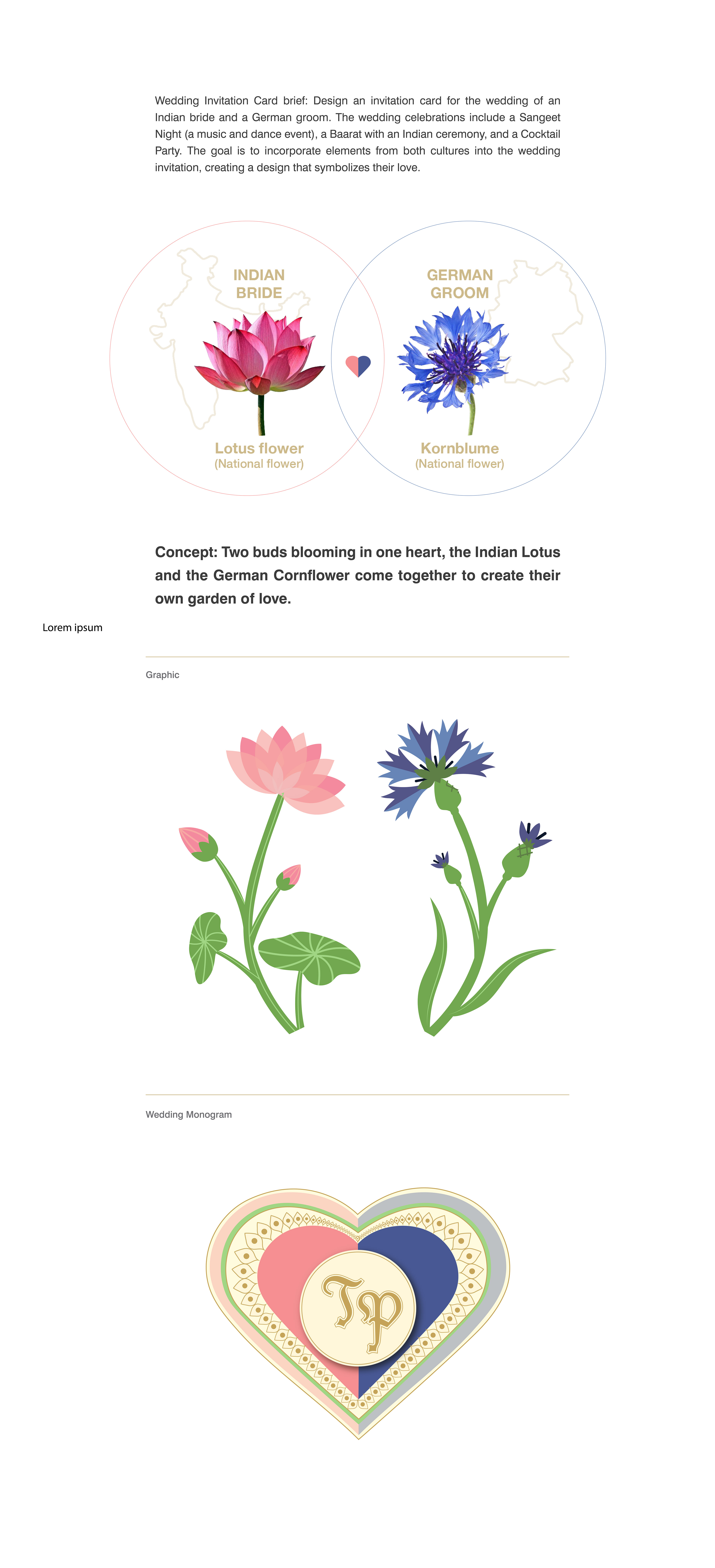 Wedding Invitation Card Brief: Design an invitation for the wedding of an Indian bride and a German groom. The wedding celebrations include a Sangeet Night (a music and dance event), a Baarat with an Indian ceremony, and a Cocktail Party. The goal is to incorporate elements from both cultures into the wedding invitation, creating a design that symbolizes their love.